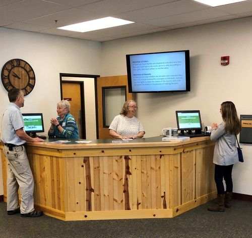 The Welcome Information Center is equipped with a kiosk for parents to check in and print name badges for infants, toddlers, preschoolers and up into Sunday School Classes. Come by and say Hello!